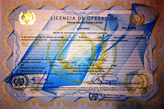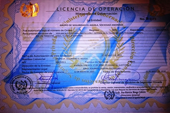 En Acuerdo Ministerial Numero 57-03 de fecha 15 de Enero de 2003 el Ministerio de Gobernación acuerda el funcionamiento de la empresa Grupo de Seguridad El Águila S.A.